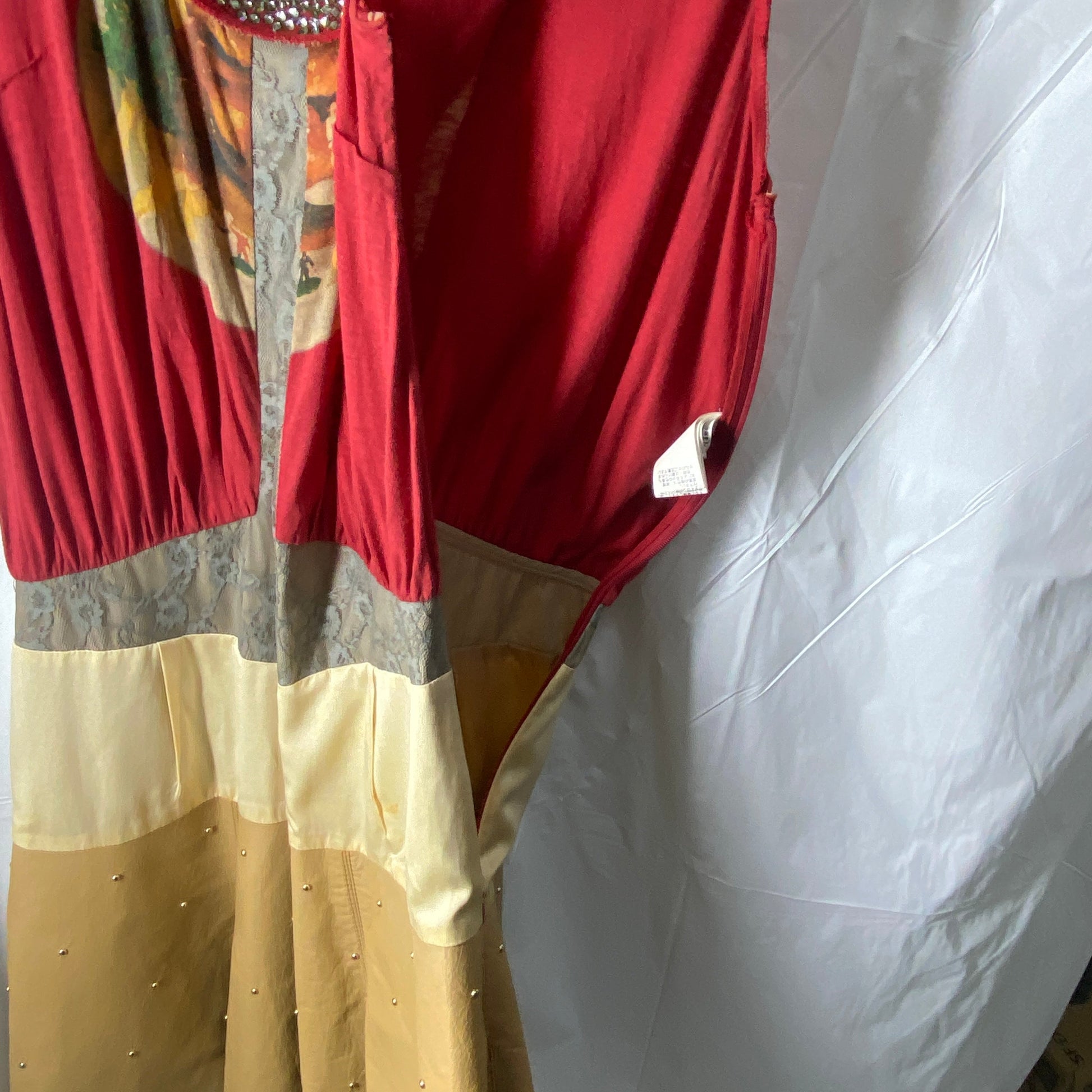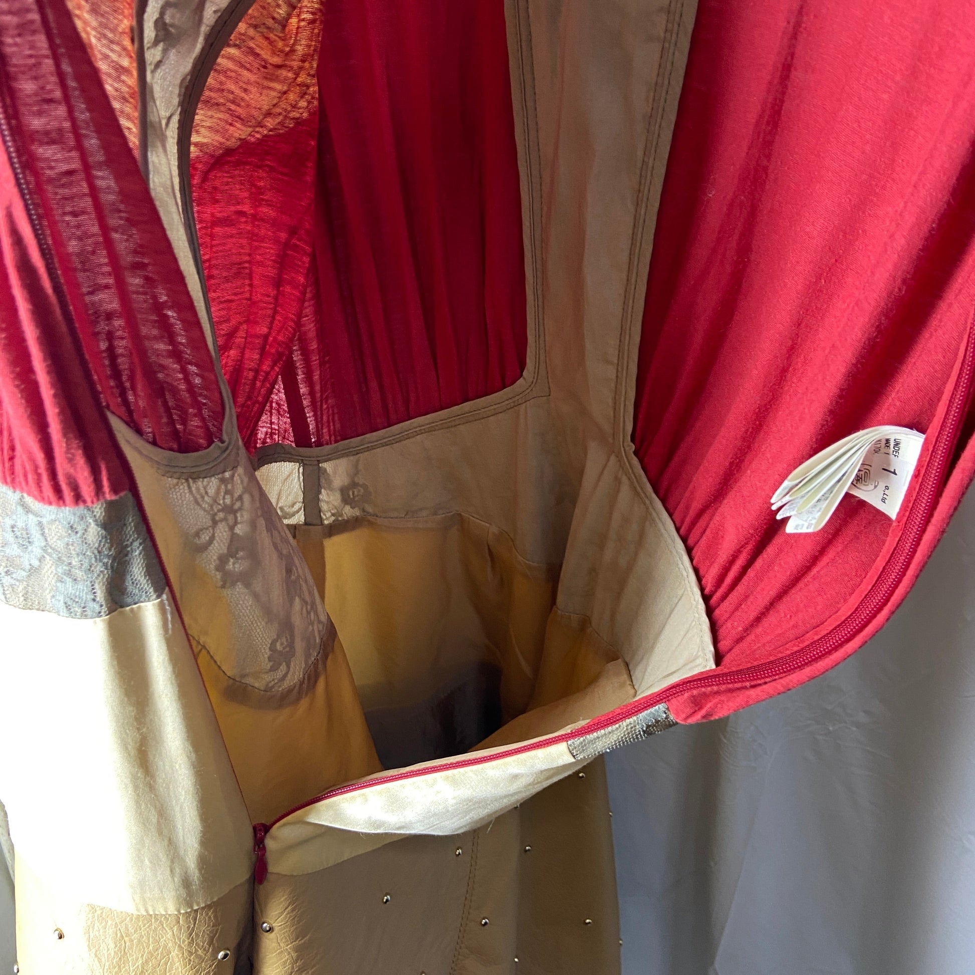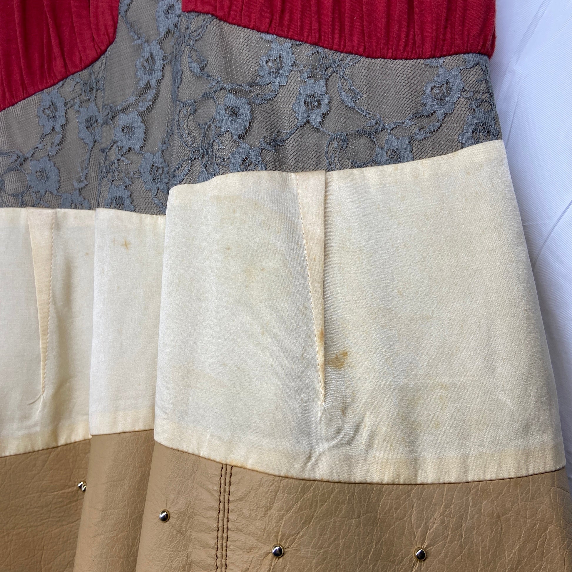 An combination of materials, cotton, mesh, lace, silk, crystals, leather and metal bits. Featuring a hamburger print thats an iconic design of the undercover brand. Weird and fun looking. Leather part has some round metal bits embossed all over it. In great condition, unfortunately there are some minor stains at the front of the dress. Not very noticeable tho