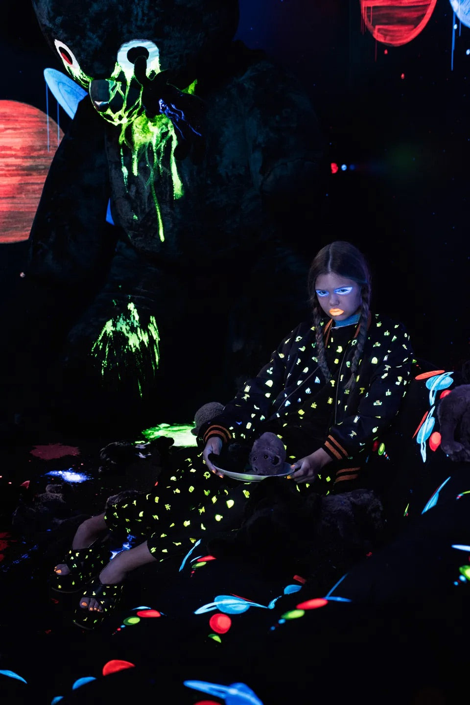 A cute coat from undercover with collaboration with John Derian, the New York découpage maestro, created the art for these few selected pieces. Featuring celestial motifs by him that come to life under ultraviolet black light. The buttons are made from uv reflective star shaped buttons as well. Looks straight from the closet of a child. Mint condition, never worn with tags and repair materials all attached. These pieces are released in very limited quantities, and have never been seen anywhere else. Quick note, if you go to Disneyland or nightclubs wearing this, the prints will all glow so it will be extra fun.