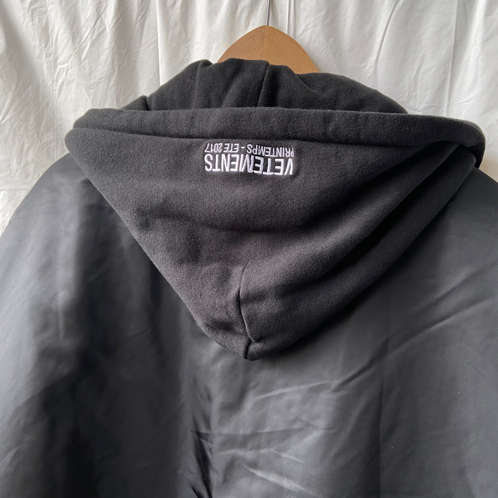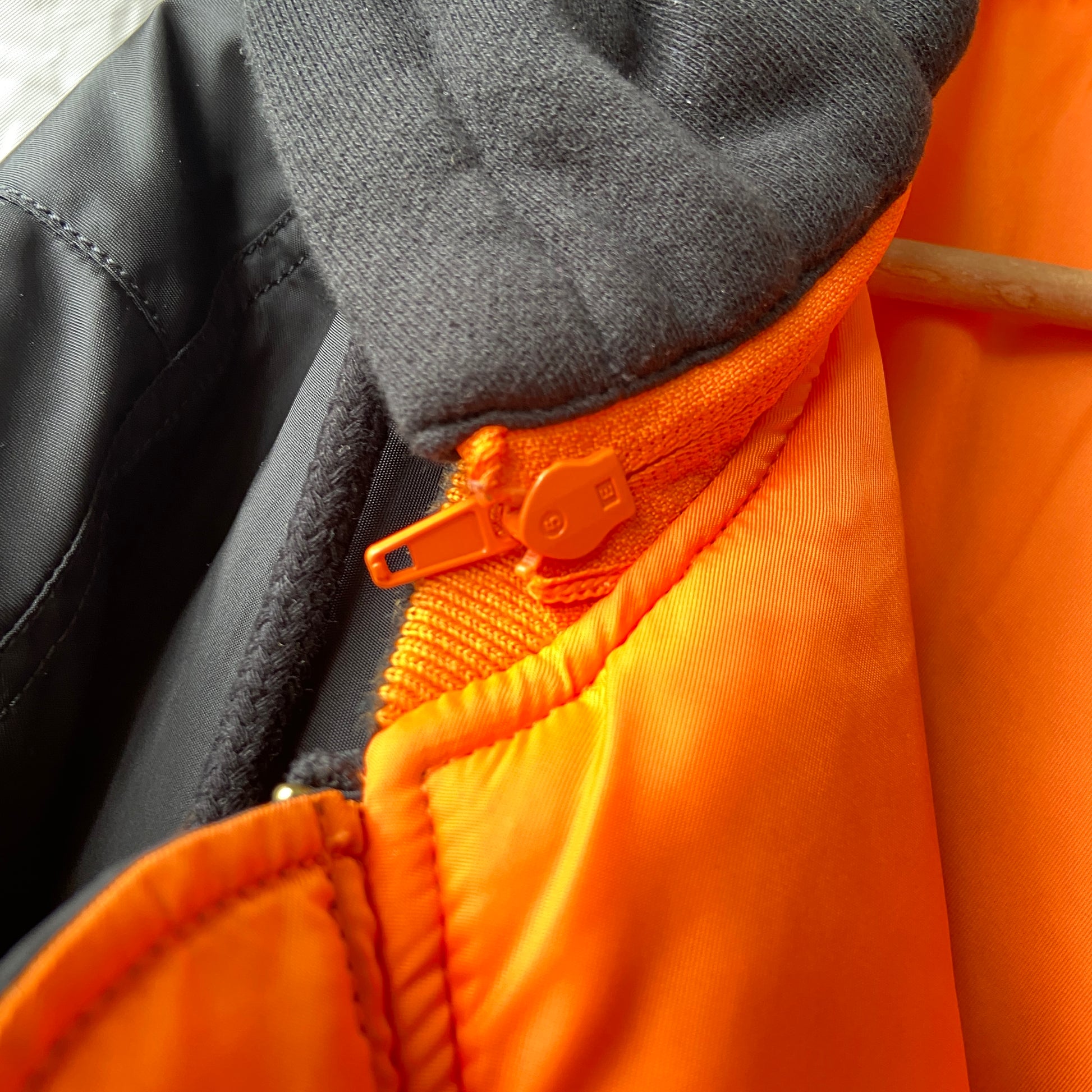 Massive massive bomber, see pic compared to a 13”. EXTREMELY rare size large. Demna combining alpha industries long established silouhette with extreme tailoring, creating one of the most iconic pieces of the decade, oversized bombers that completes as a real statements piece. In mint condition 10:10, not even signs of usage. With the usuals of an alpha bomber, “remove before flight” and “vetements” tags. Removable hood. Reversible orange side, featuring two seperate mechanisms that allow the wearing to contract the bomber, one zipper system and snappers on each side of the bomber. Totally insane piece.