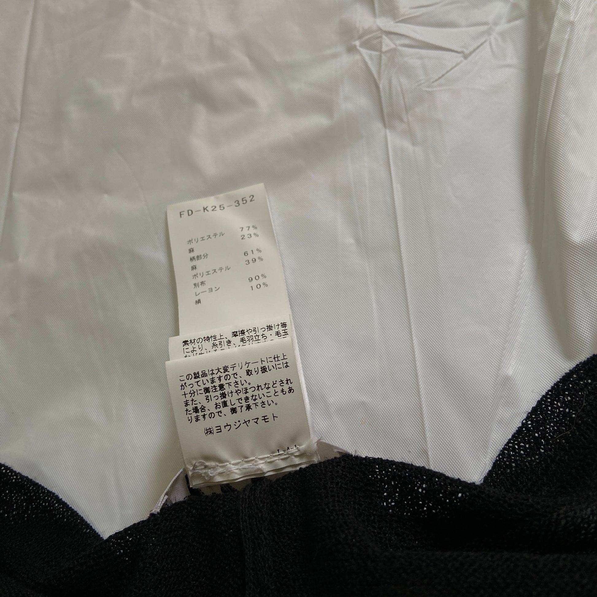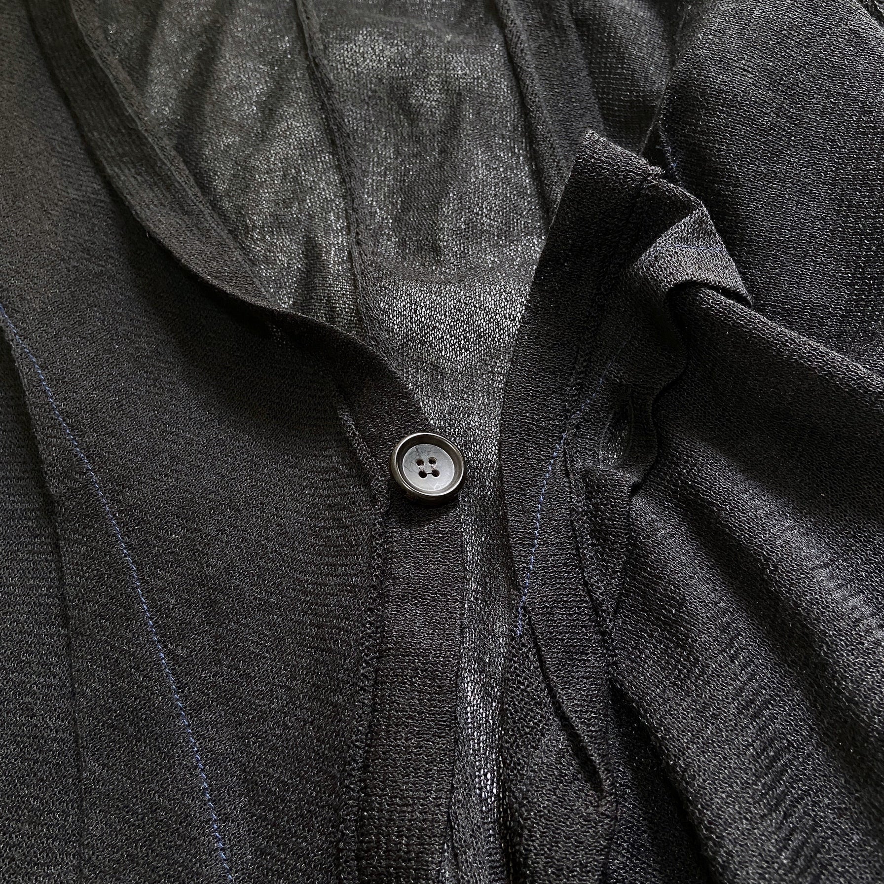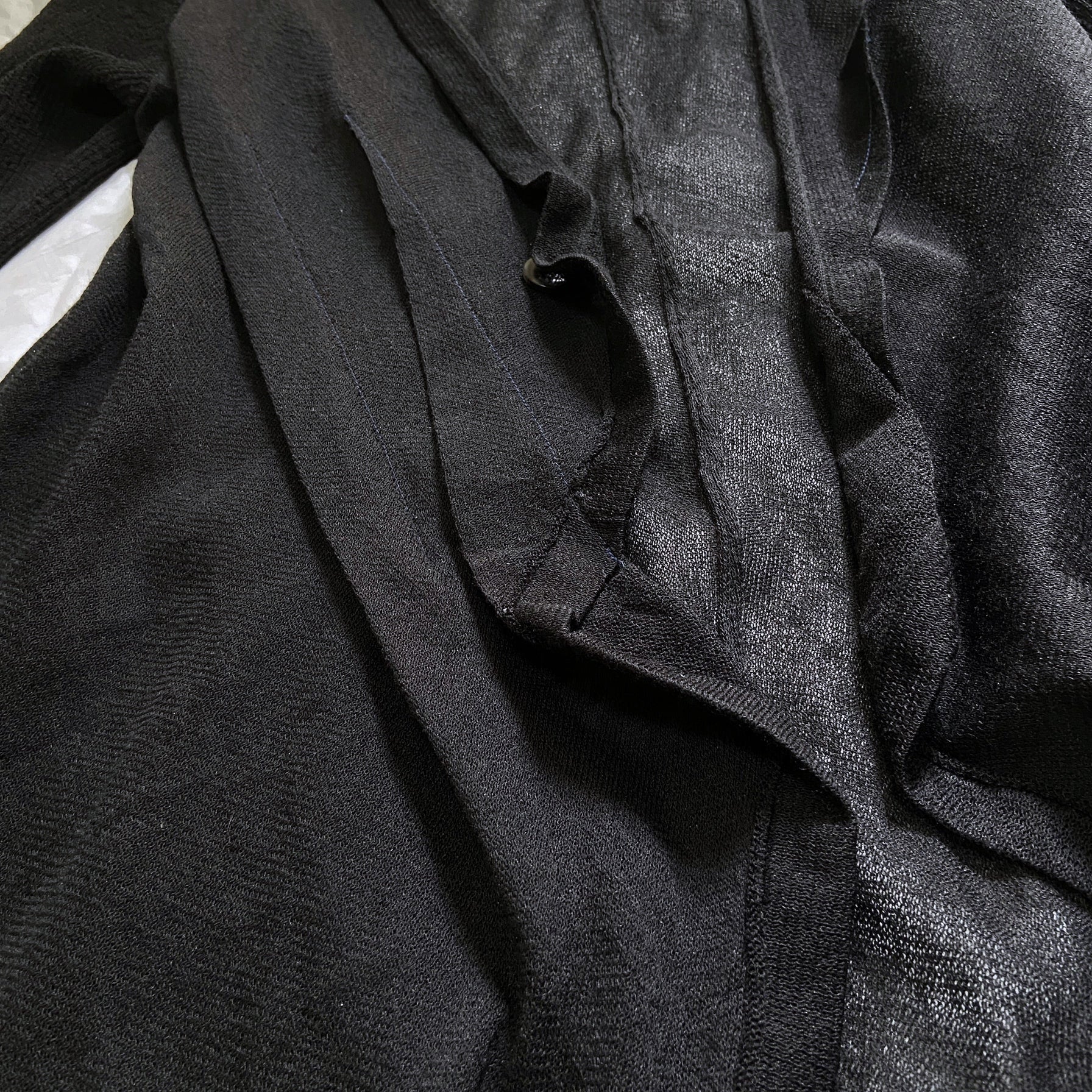 A very delicate long wrap cardigan with multiple folds that creates a very flowy look. In true yohji black unbalanced way, the cardigan features a blue/purpleish pattern on the left side. Sheer see through material great for spring summer. I. Mint condition, no rips or stains