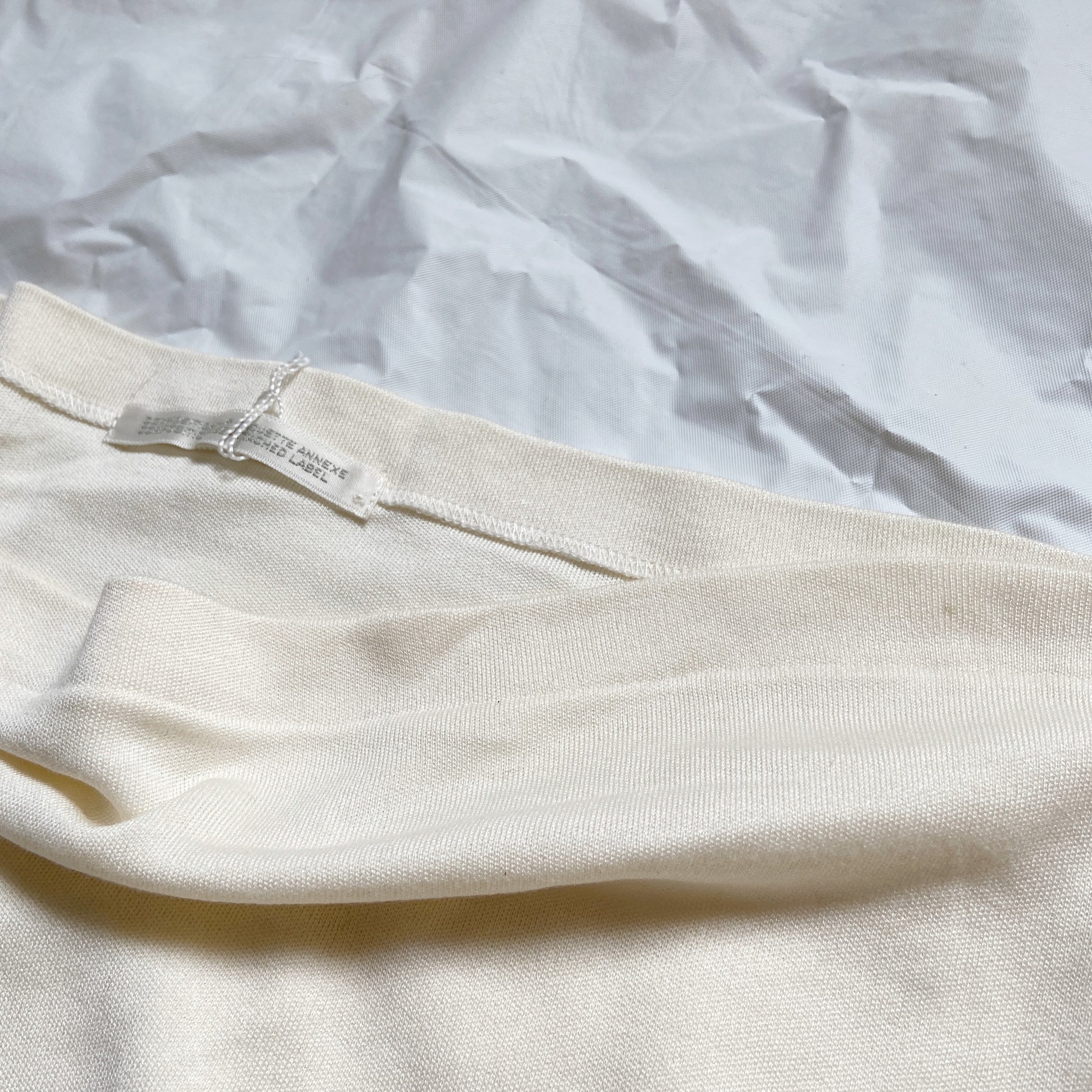 Stunning top from Yohji Spring 1998. Minimalistic design with one sleeve design and striped waist. The garment is in a cream colourway. Some minor signs of use.