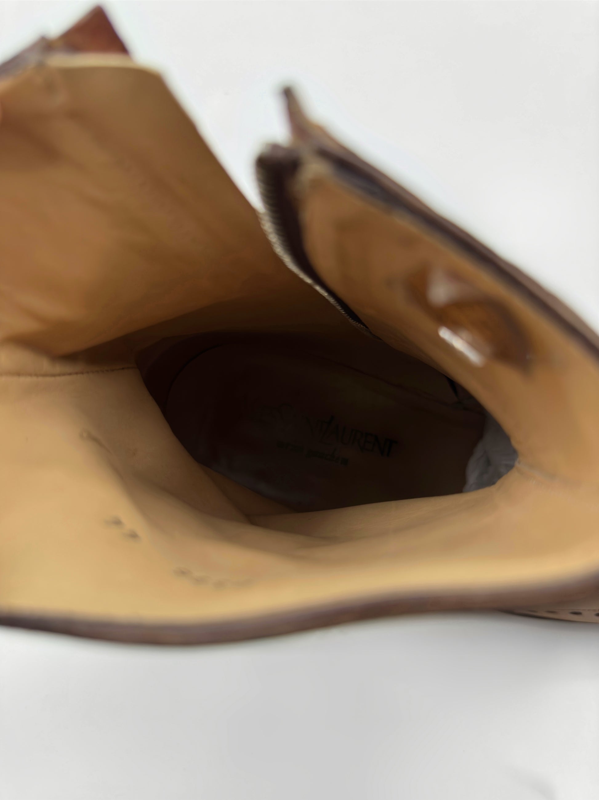 Beautifully aged supple brown leather with wingtip detail, hidden zipper with YSL logo engraving, and of course the 65mm cuban heel